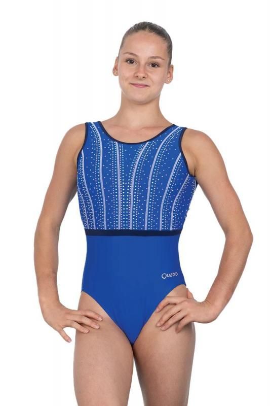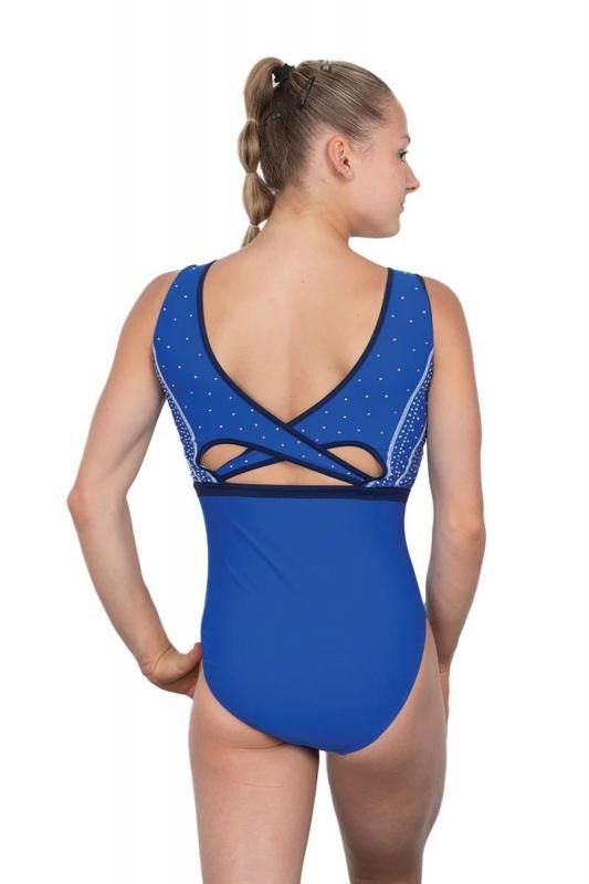 ロイヤルブルーのライクラボディは、ウエスト、首、腕のネイビーのトリムで縁取られ、洗練されたコントラストを生み出しています。