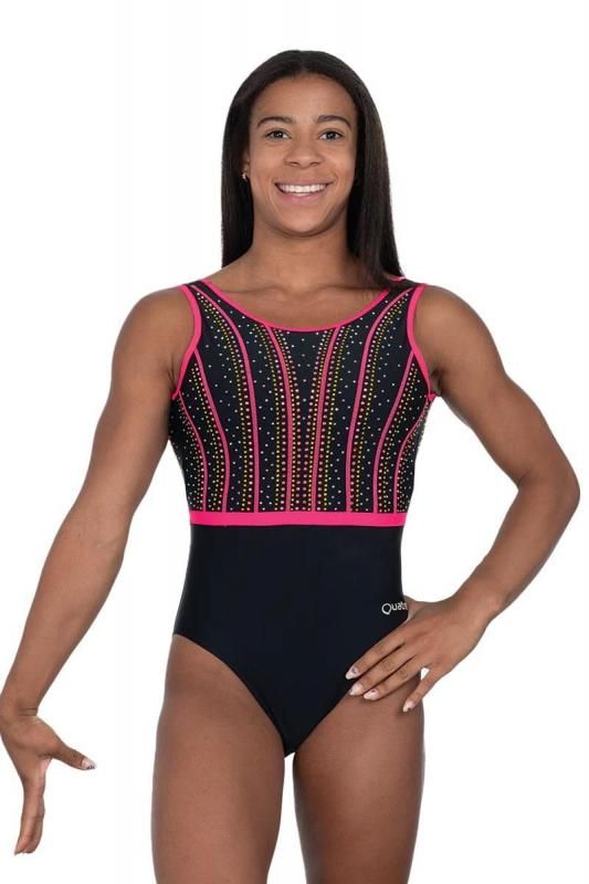 このレオタードは、ブラックのライクラボディに、ウエスト、ネック、アームに鮮やかなオレンジエードのトリムを施し、目を引く鮮やかなカラーリングを演出しています。