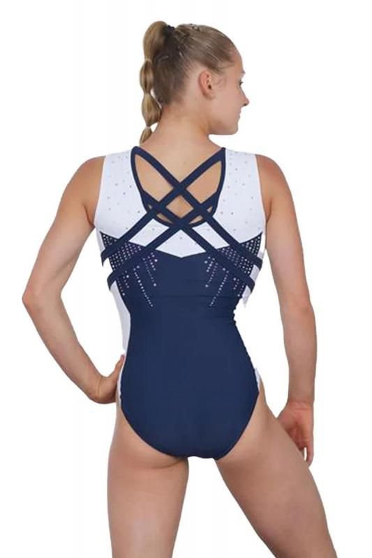 ラウンドネックからVバックへと流れるようなネックラインは、ネイビーとホワイトのクロスオーバーストラップで仕上げられ、動きやすさと自信に満ちた存在感を両立しています。